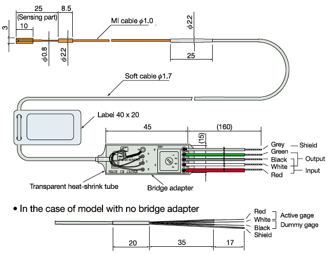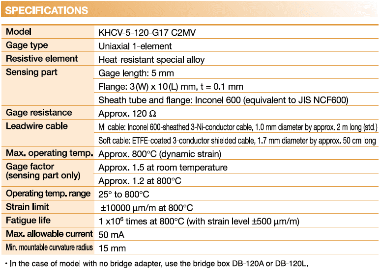 With the KHCV, gauge factor is improved by approximately 50% over our forerunner previous model. This is realized through improvement of the spot-welding method and adoption of a low-resistance Ml cable. Also realized is the 120 Q gage resistance in 5 mm gauge length.